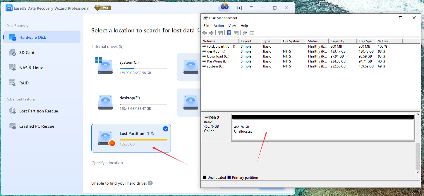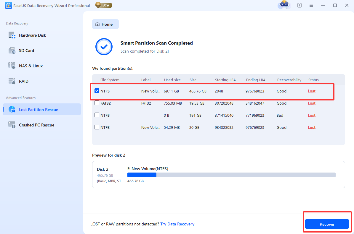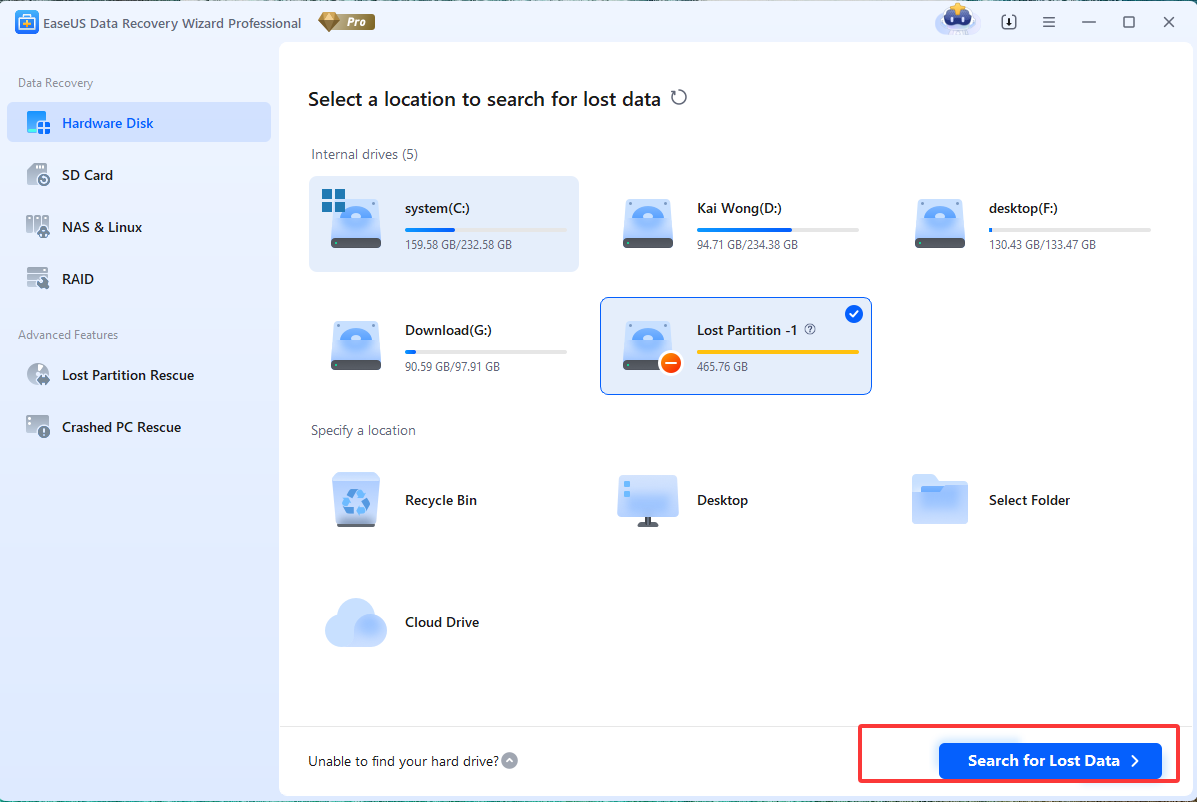 Partitions may be lost due to power outages, accidental deletion, disk failures, or other issues. EaseUS Data Recovery Wizard is a dedicated tool designed to recover files — including photos, videos, audio, and more — from lost partitions on internal or external hard drives, USB flash drives, SD/memory cards, and other storage devices.
