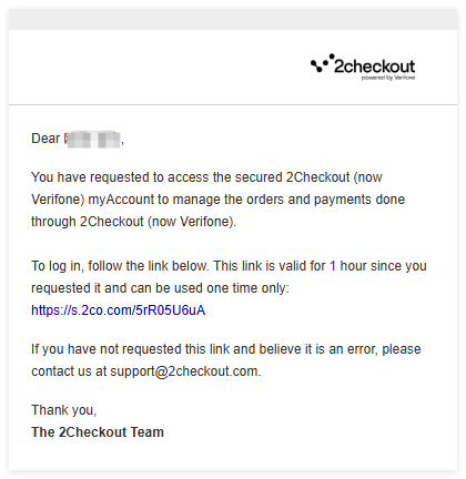 Step 3. If the email address you entered is associated with a 2Checkout order, you will shortly receive an email with a login link valid for 1 hour. Click on the link in the email to log into MyAccount.