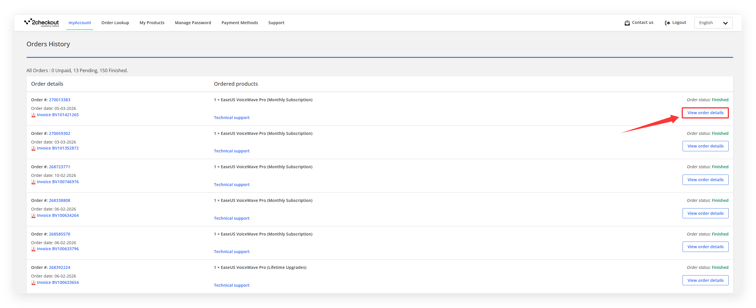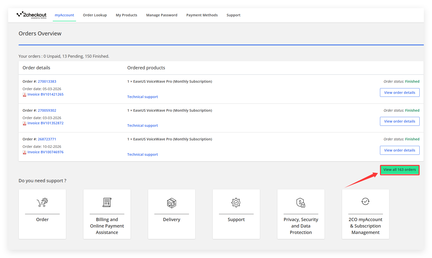Step 4. After logging into MyAccount, click View all XXX orders to get a list of all your 2Checkout orders.