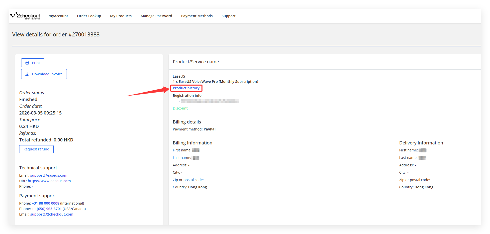 Step 6. You will access the page to review the detailed information for this order, including your billing and delivery information, license code, unit price and tax information etc. Click Product history on this page.