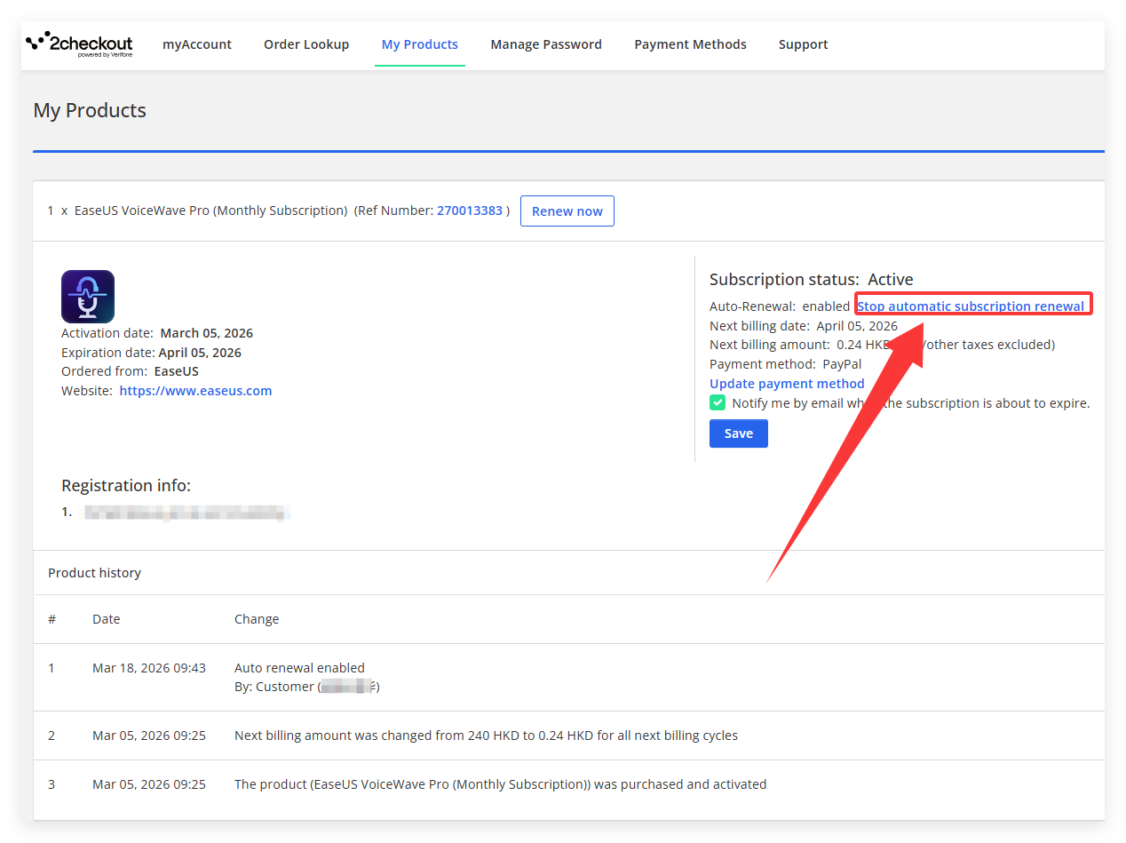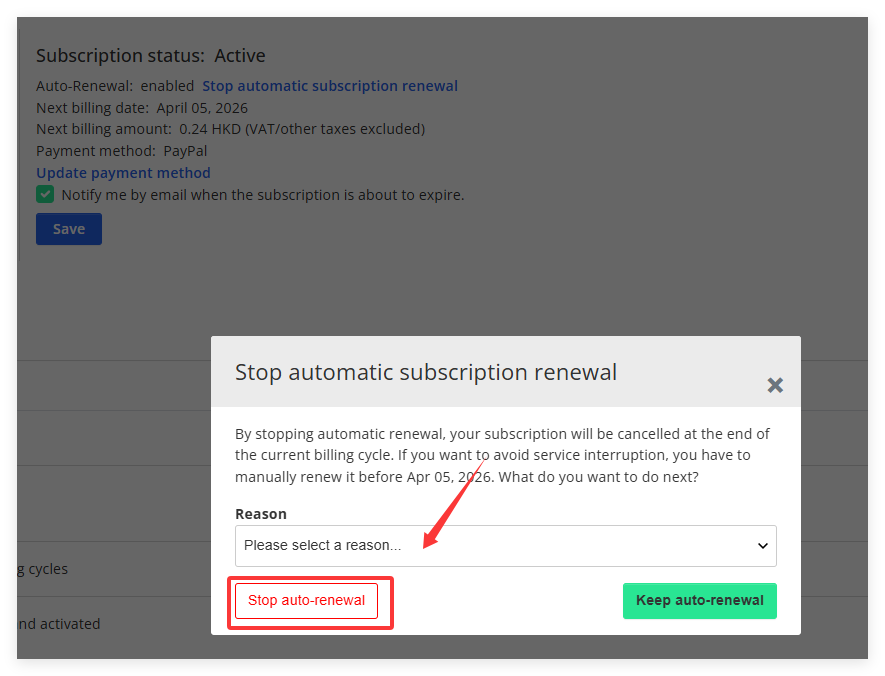Step 7. If the subscription status is Active showing in this page, your order will be automatically renewed based on your subscription plan. Click Stop automatic subscription renew and confirm it in the prompted window to disable the auto renew.